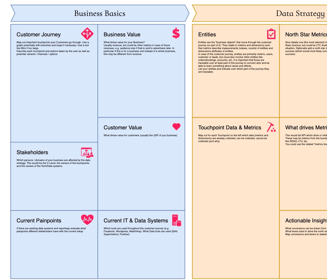 Aufgrund unserer Erfahrung mit Datenberatungsprojekten für Unternehmen wie mobile.de/ eBay, P&C, Siematic, One Hiring, etc. wissen wir, welche Fragen zu stellen sind. Dieses Wissen haben wir in einem Data Thinking Canvas zusammengefasst, das dafür sorgt, dass