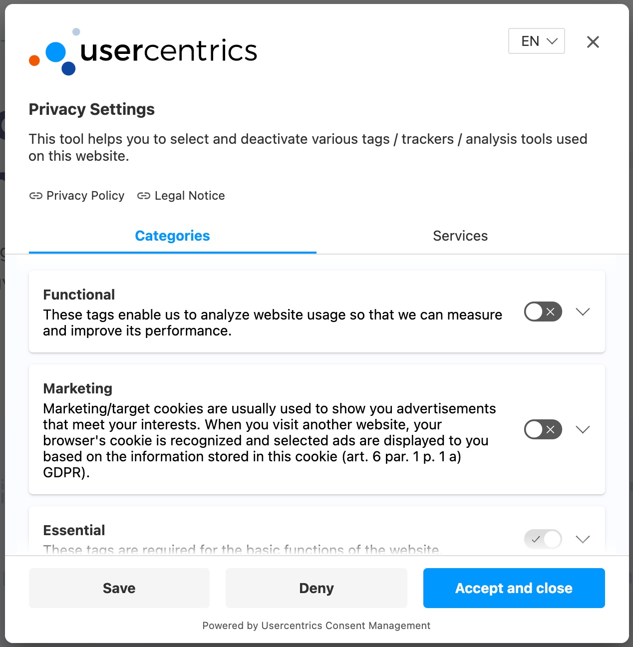Trotzdem ist diese Lösung nicht 100%ig DSGVO-konform. So ist es dem Nutzer z.B. nicht möglich einzelne Trackingpixel oder zumindestens Kategorien wie "Analyse" oder "Werbung" separat auszuwählen.